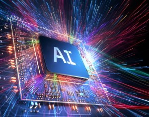 AI word on microchip and colorful light spread with strong beam , AI concept with copyspace banner background, Generative AI.