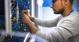 Side view portrait of young man wearing glasses connecting cables in server cabinet while working with supercomputer in data center