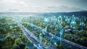 Blueprint of a futuristic smart city with interconnected buildings and sustainable energy systems