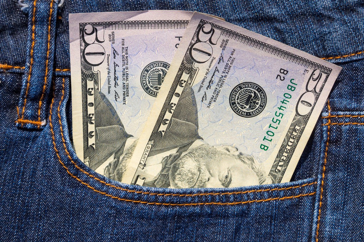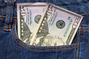 Fifty American dollars bills in the pocket of blue jeans