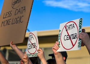 Protestors demonstrate in opposition to a proposed data center at a vacant lot on Sherman Drive on Oct. 13, 2025, in the Martindale Brightwood neighborhood of Indianapolis.