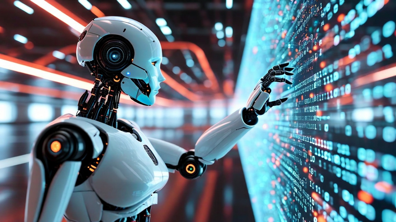 The,Image,Shows,A,Humanoid,Robot,Interacting,With,Digital,Binary